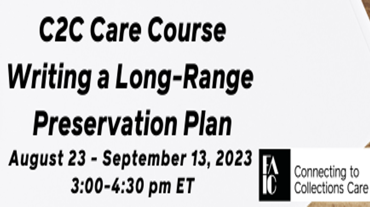 A Long-Range Preservation Plan (LRPP) is a core document that both identifies priorities for conservation and preservation projects and outlines a course of action for their completion. The LRPP is a powerful tool for communicating goals and progress with an institution’s board or parent organization, for galvanizing support from administration and staff, and for obtaining grant funding for specific projects. Geared toward small and mid-sized cultural institutions, in this course participants will learn the essential components of a LRPP, become familiar with key preventive conservation concepts, and gain skills in both risk assessment and the prioritization of preservation needs. Through in-class assignments and a recommended 4-6 hours/week of independent work time between sessions, participants will conclude this course with a draft LRPP for their organization.